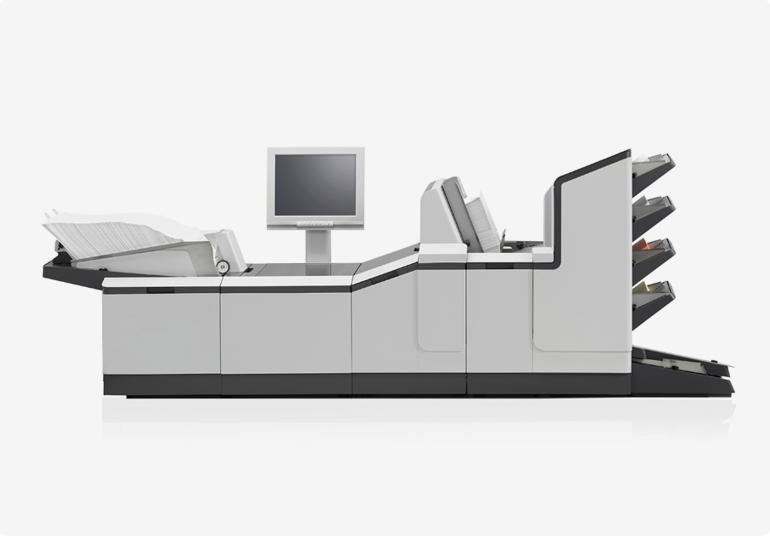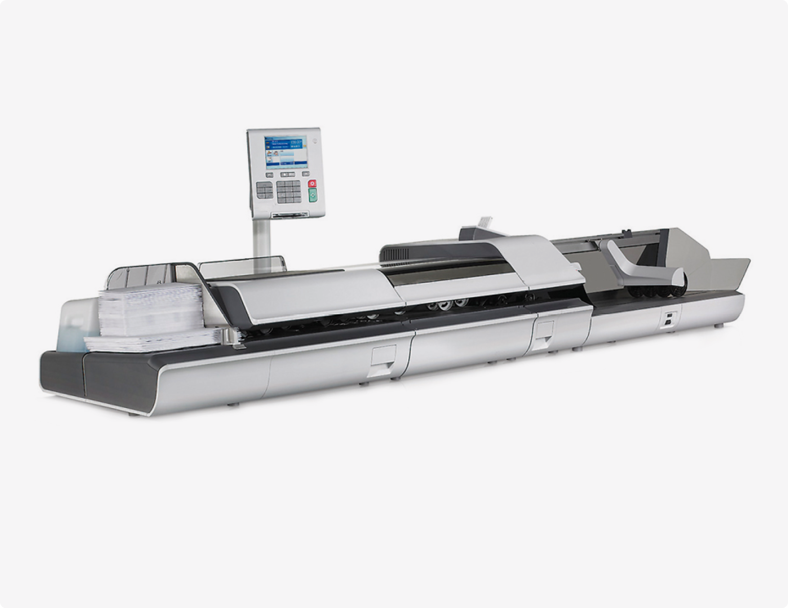 Währenddessen werden die anderen Bestandteile der Briefsendung oder des Mailings von der Kuvertiermaschine im Einschub registriert, gelesen (über Barcodes, OMR-Code und DataMatrix-Code) und automatisch wie gewünscht gefalzt. Die Maschine erkennt dabei die unterschiedlichen Dokumentenformate und doppelte Papiereinzüge. Auf Ihrem Weg zur Kuvertierung werden die Anschreiben, Beilagen und anderen Briefbestandteile in das ge- öffnete Kuvert geschoben. Der gummierte Verschluss des Kuverts auf der Rückseite wird im letzten Schritt angefeuchtet, geschlossen und fest verklebt. Auch hier landen die fertigen Briefsendung in einem Auffangbecken, aus dem sie in eine Postbox sortiert und für die Weiterverarbeitung oder die Einlieferung bei der Post bereitgestellt werden.